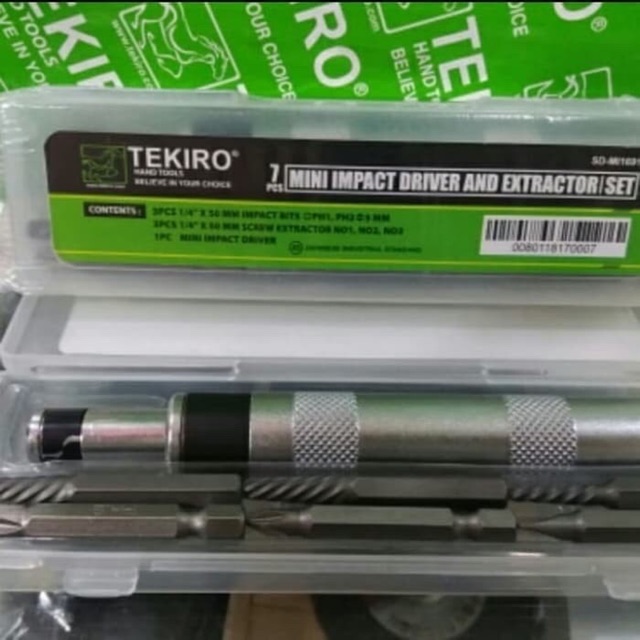 Obeng Ketok Mini Tekiro 7Pcs - Mini Impact Driver And Extraktor SetTekiro Impact Driver Set and Extractor SetObeng Ketok Tekiro Obeng Getokdan Tap Balik Tekiro untuk baut patahSpesifikasi 7 pcs :3pcs 1/4"x50mm Impact Bits (+)PH1, PH2, (-)5mm3pcs 1/4"x50mm screw extractor no.1, no.2, no.31pcs Mini Impact De