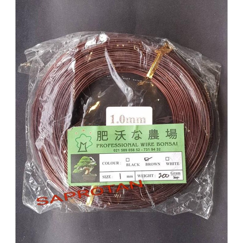 IMPORT chinaKawat bonsai ALUMINIUM warna coklat ukuran 1mm berat 200 gram/packKawat bonsai ini lunak dan mudah di tekuk, karena prosentase aluminium tinggi .ukuran ini (1mm) banyak dipakai untuk mame bonsai dan small.Silahkan diorder, stocknya terus berjalan yaa, terima kas