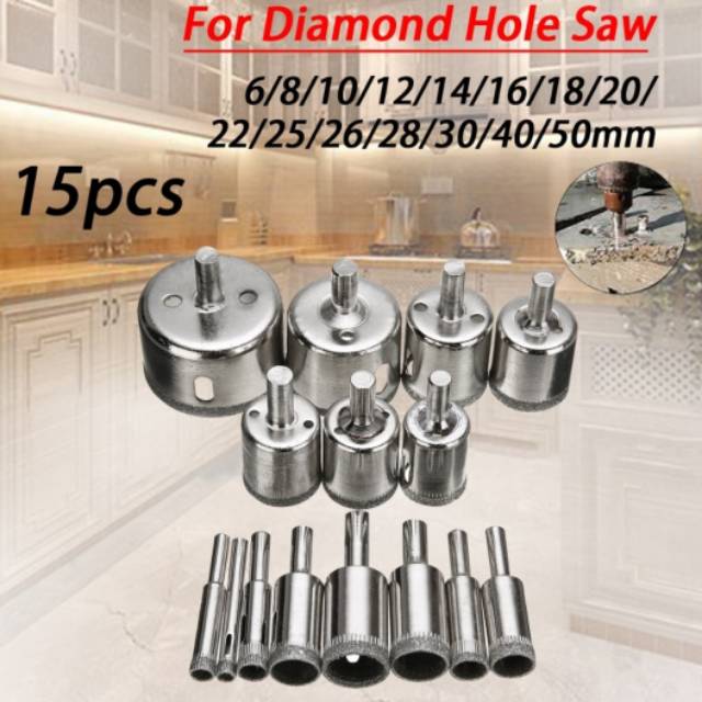 Mata bor ini terbuat dari bahan besi dan dilapisi diamond coated sehingga mata bor ini dapat digunakan untuk melubangi berbagai benda seperti keramik dan kaca. Anda mendapat 15 buah mata bor dengan beberapa ukuran yaitu 6/8/10/12/14/16/18/20/22/25/26/28/30/40/