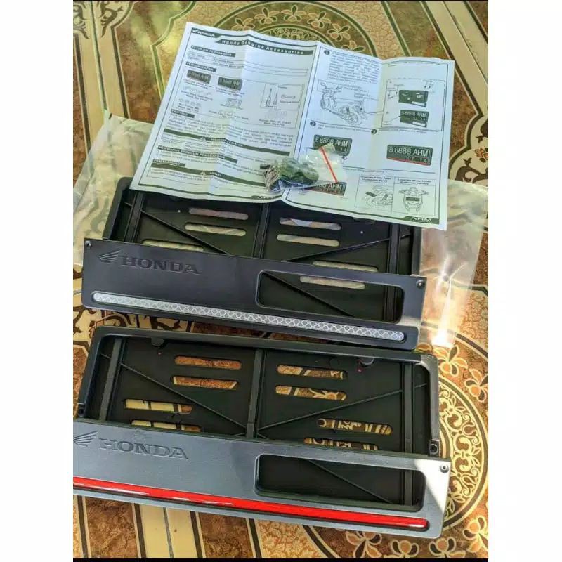Dudukan Plat Nomor Motor Hondaa 1 set ( isi 2pcs) 1 depan lis putih1 belakang lis merah. harga 17 ribu dapat 2 depan dan belakang y ganklw tdak original anda kembalikan jamiman uang kembali 10× lipat ORDER PAKEK Expedisi JNT MAKA DI KIRIM HARI ITU JUGA SELAIN JNT MAKA IKUT BESOKNYA Isi 1 Set ( 2 pcs depan list putih , belakang list merah) = isi 2 pcs, lengkap beserta mur dan baut2nya.. 17 ribu dapat 2 bji 1 kg muat 3 pcsKeunggulan:- Produk Asli Hond Genuine Accessories, kualitas terjamin- Dudukan Plat nomor modern dan melindungi Plat- Mudah dibersihkan, karena tidak semua nya tertutup sehingga mudah untuk dibersihkan dan tidak membuat butek plat seperti pelindung - pelindung plat lainnya- Terdapat LED Skotlet, yang membuat Pelindung Plat menyala jika disorot lampu, dapat meningkatkan keamanan agar tidak ditabrak dari depan maupun belakang.- Bahan Tebal KuatUntuk Dimensi Plat Panjang 28 cm x lebar