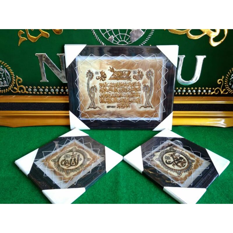 Bismillah..Kami menyediakan berbagai macam kaligrafi kulit kambing dengan berbagai motif dan ukuran.Bahan : kulit kambingBingkai : kayu mahoni sudah diplitur anti rayap dan sudah dilapis plastik.Satu set berisi 3 pcs :- kaligrafi kulit lafadz Allah ukuran 25×25cm- kaligrafi kulit lafadz Muhammad ukuran 25×25cm- kaligrafi Ayat Kursi ukuran 35×54cmSilahkan cek toko kami untuk melihat koleksi kaligrafi lainnya. Trimakasih.selamat berbe